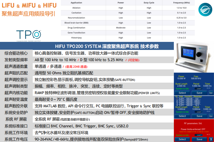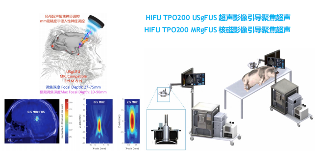 具体科研用途:Ablation热消融,Cavitation 空化动力,Neurostimulation & Neuromodulation 神经调控,BPM 血压调节,BBB 血脑屏障破除,BSCB 血脊髓屏障破除,Drug Delivery 药物导入激活,Gene Transfection基因转染,Histotripsy 组织摧毁术,NIV/NIT 远程触诊,Organ Stimulation 组织脏器刺激恢复,DSP 超声打印,Material Application 材料学和 HIFU Based UWLM 激光切割水约束,其他科研医疗研究等。